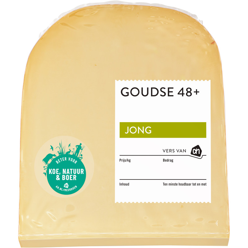 Geniet van de heerlijke, milde smaak van onze AH Goudse jong 48+. Deze romige kaas, gemaakt van 100% weidemelk, is de perfecte aanvulling op je boterham of als snack uit het vuistje. Doordat onze melk afkomstig is van koeien die veel buiten in de wei lopen, draagt deze kaas bij aan een betere natuur en een eerlijke beloning voor onze boeren. Eenvoudig te gebruiken in al je favoriete gerechten en ideaal om te combineren met frisse ingrediรซnten zoals komkommer. Laat je inspireren door de veelzijdigheid van deze heerlijke kaas!