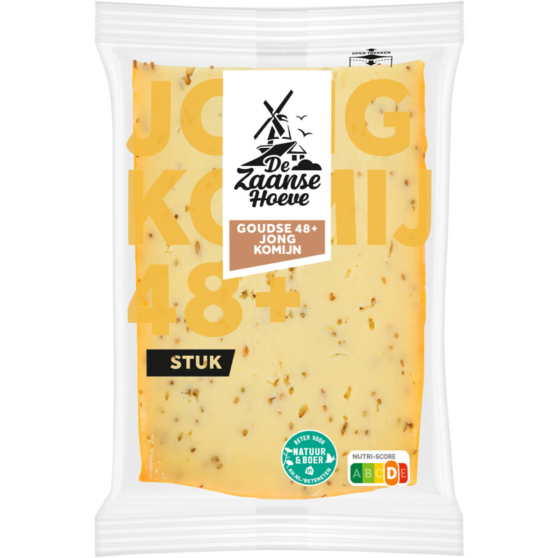 Geniet van de zachte en gekruide smaak van De Zaanse Hoeve Jong Komijn 48+, gemaakt van 100% weidemelk. Deze heerlijke kaas bevat 2% komijnzaad en is perfect voor op de boterham, als snack of om te smelten op een warm croissantje uit de oven. Met een portiegrootte van 20 gram zijn er maar liefst 23 porties van dit smaakvolle kaasproduct. Duurzaam geproduceerd met liefde voor koe, natuur en boer.