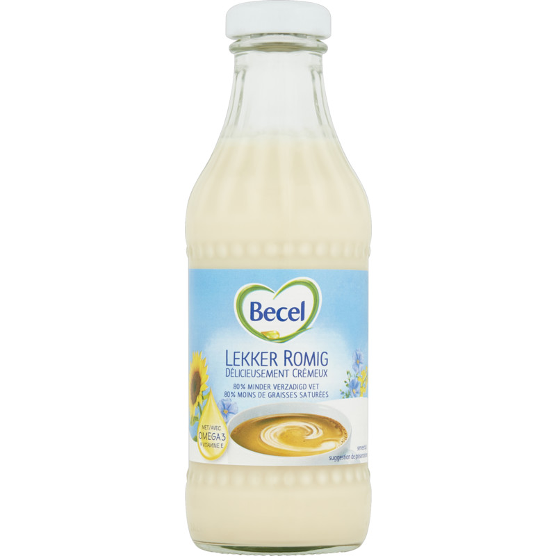 Becel Romig voor in de Koffie voegt een heerlijke romige smaak toe aan je kopje koffie. Deze unieke mix van plantaardige oliรซn en magere geรซvaporeerde melk is perfect als koffiemelk, maar ook als roomvervanger in diverse gerechten. Met 80% minder verzadigd vet dan reguliere koffiemelk en verrijkt met omega 3 en vitamine E, draagt het bij aan een gezond hart. Probeer het eens in sauzen, soepen of een gratin voor een extra romige bite.