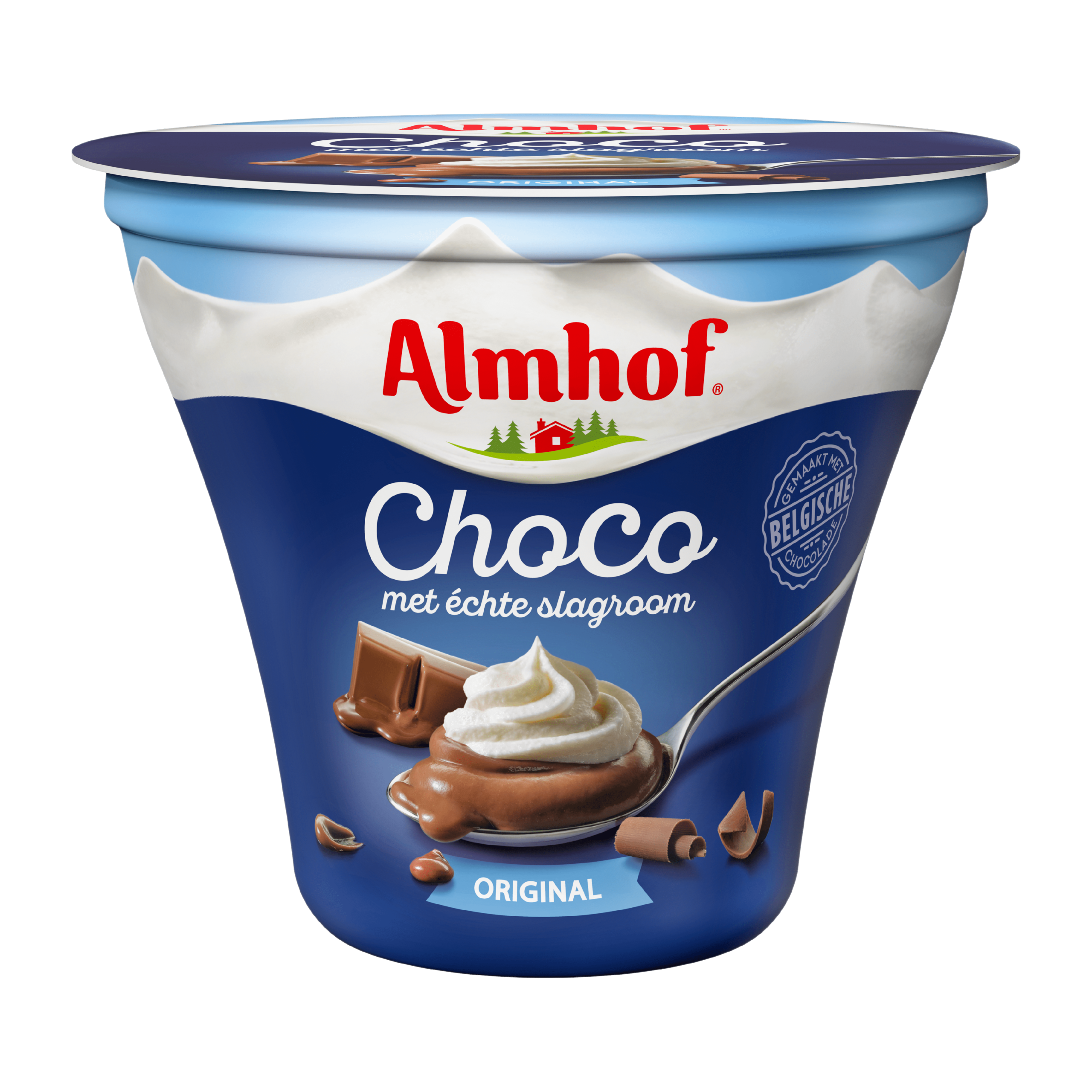 Geniet van het romige chocolade dessert Almhof Choco met slagroom original, gemaakt van eersteklas Belgische chocolade en voorzien van een toef รฉchte slagroom. Dit dessert biedt een heerlijke en rijke smaakbeleving, perfect als verwenmoment. Gekoeld bewaren voor de beste smaakervaring.