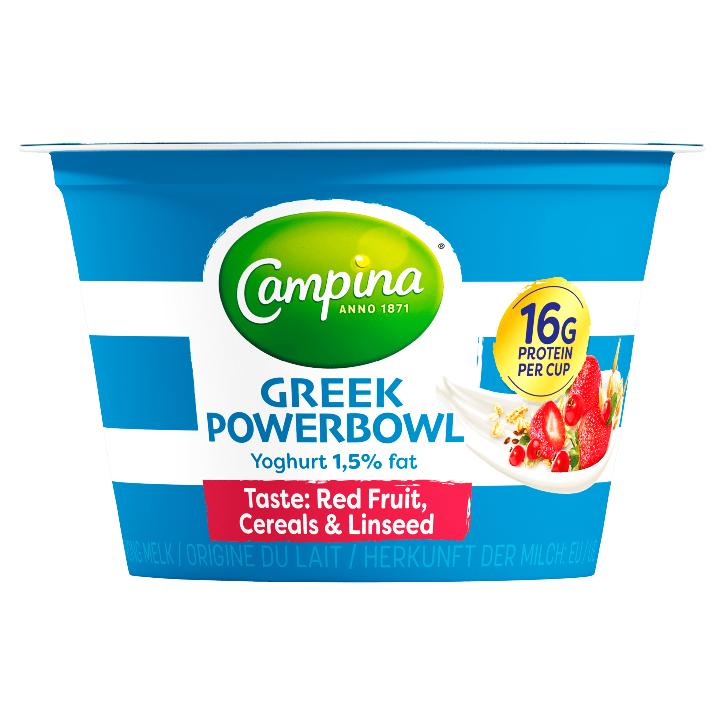 Geniet van de Campina Powerbowl Rood Fruit, een heerlijke Griekse yoghurt van 1,5% vet, verrijkt met aardbeien en rode bessen. Deze powerbowl zit boordevol proteรฏne en levert maar liefst 16g eiwitten per portie. Perfect voor een gezonde start van je dag of als voedzame snack. Bewaar gekoeld voor de beste smaakervaring.